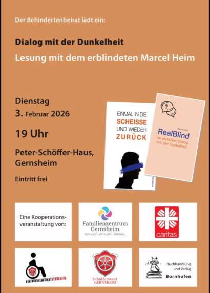 Am Dienstag, den 3. Februar 2026, lade ich herzlich zur Lesung „Dialog mit der Dunkelheit“ ins Peter-Schöffer-Haus in Gernsheim ein. Als blinder Autor spreche ich offen über meine Erfahrungen, Herausforderungen und Erkenntnisse und lese aus meinen Büchern „Einmal in die Scheisse und wieder zurück“ sowie „RealBlind – Im ehrlichen Dialog mit der Dunkelheit“. Es erwartet euch ein ehrlicher Abend voller Tiefe, Humor und Begegnung.